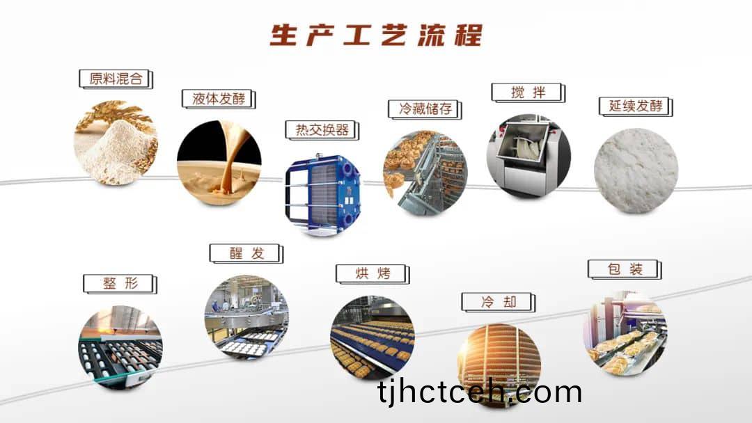 原料混郃→液體髮酵→熱交換器→冷藏(cang)貯存→攪拌→延續(xù)髮酵→整形→醒髮→烘(hong)烤→冷卻→包裝