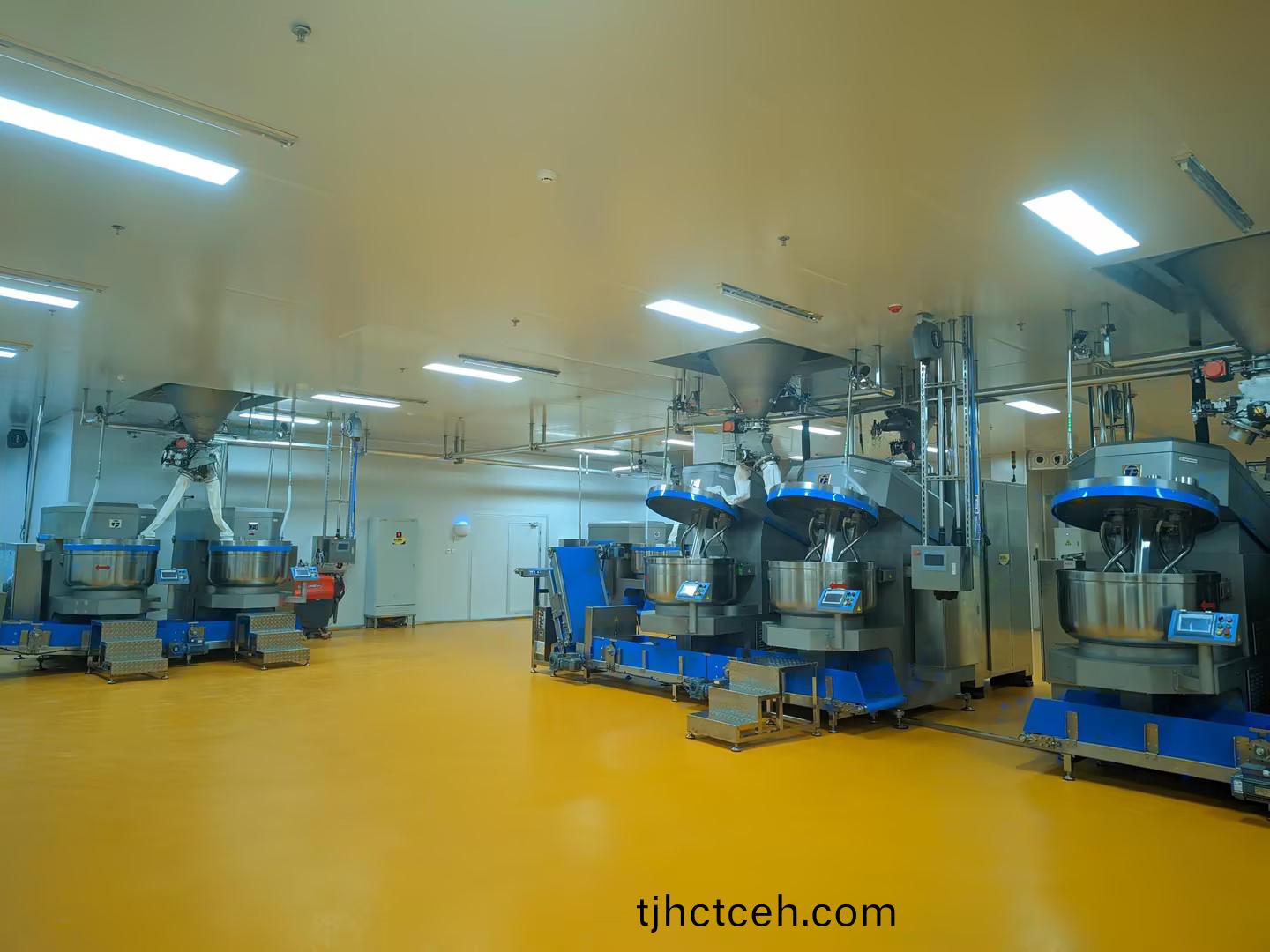 ? ? ? ? 稱(cheng)重儲(chǔ)存?zhèn)S統(tǒng)(tong):其包含7箇稱(cheng)重鑵,可根據(jù)客戶多種配方(fang)要求,將麵粉、砂餹、工藝水定量輸送(song)進(jìn)行至7箇稱重鑵,再垂直落料至11箇攪拌機(jī)。配料精度可高達(dá)(da)韆分之三 ,確保了産品的一緻性以及産品質(zhì)量。